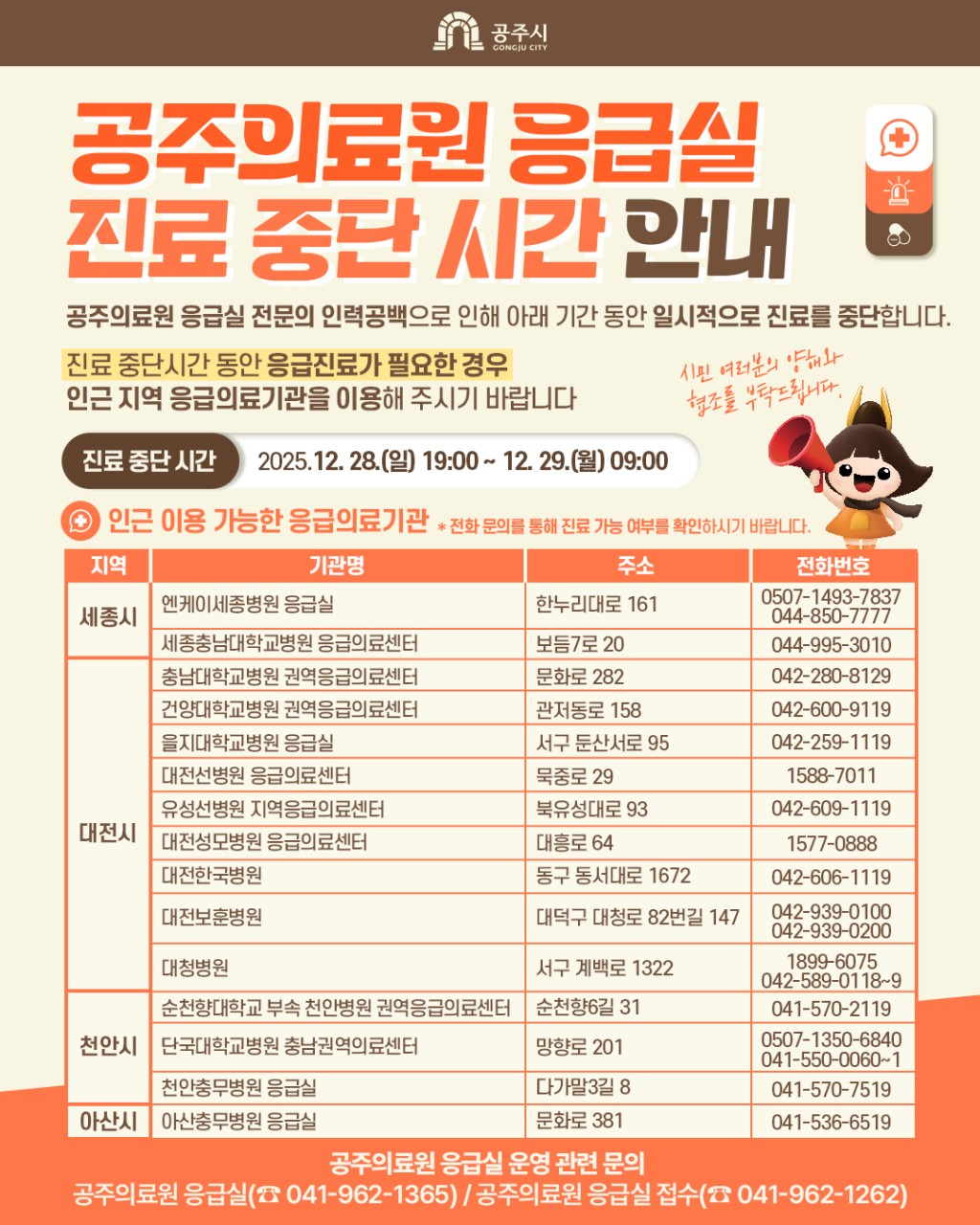 충청남도공주의료원 응급실 진료 중단 안내 / 2025.12.28.(일) 19:00~2025.12.29.(월) 09:00